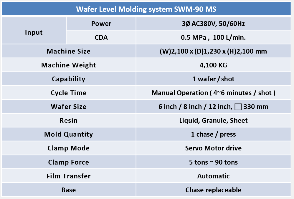 Equipped with independent control of 4 servo motors, achieving micrometer level parallelism while maintaining 8-speed compression molding, achieving uniform resin flow in the mold cavity and achieving ultra-high WLP packaging.