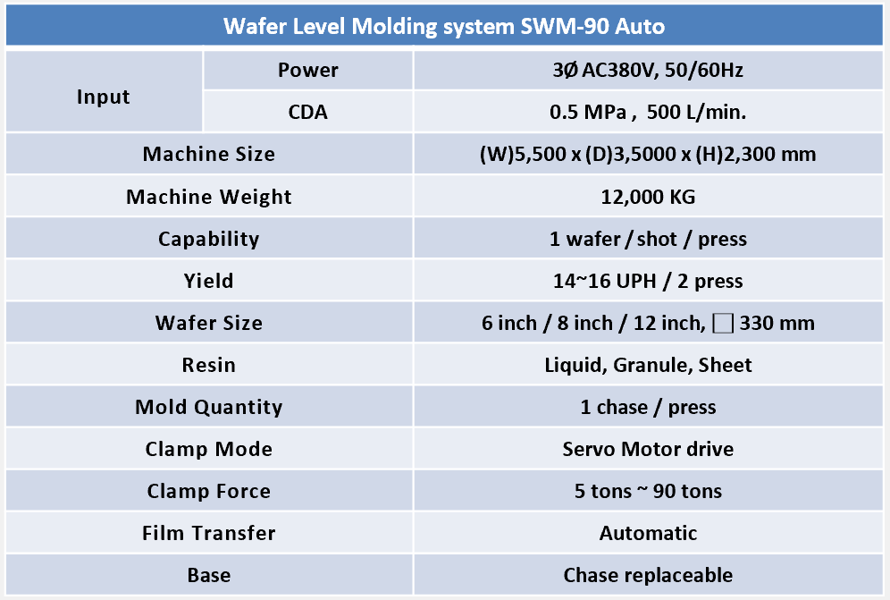 Equipped with independent control of 4 servo motors, achieving micrometer level parallelism while maintaining 8-speed compression molding, achieving uniform resin flow in the mold cavity and achieving ultra-high WLP packaging quality.